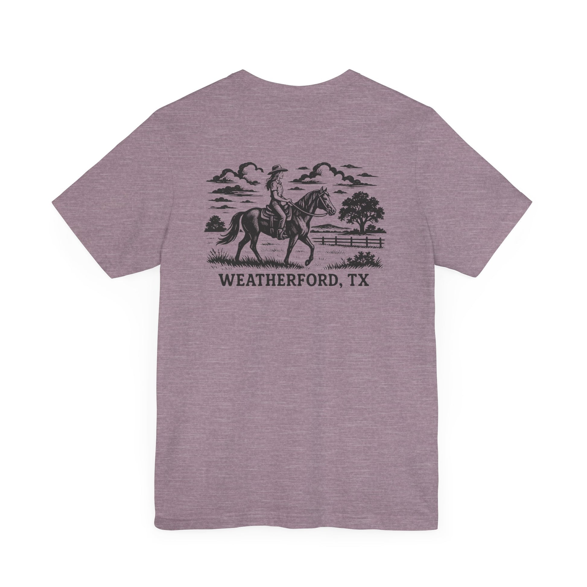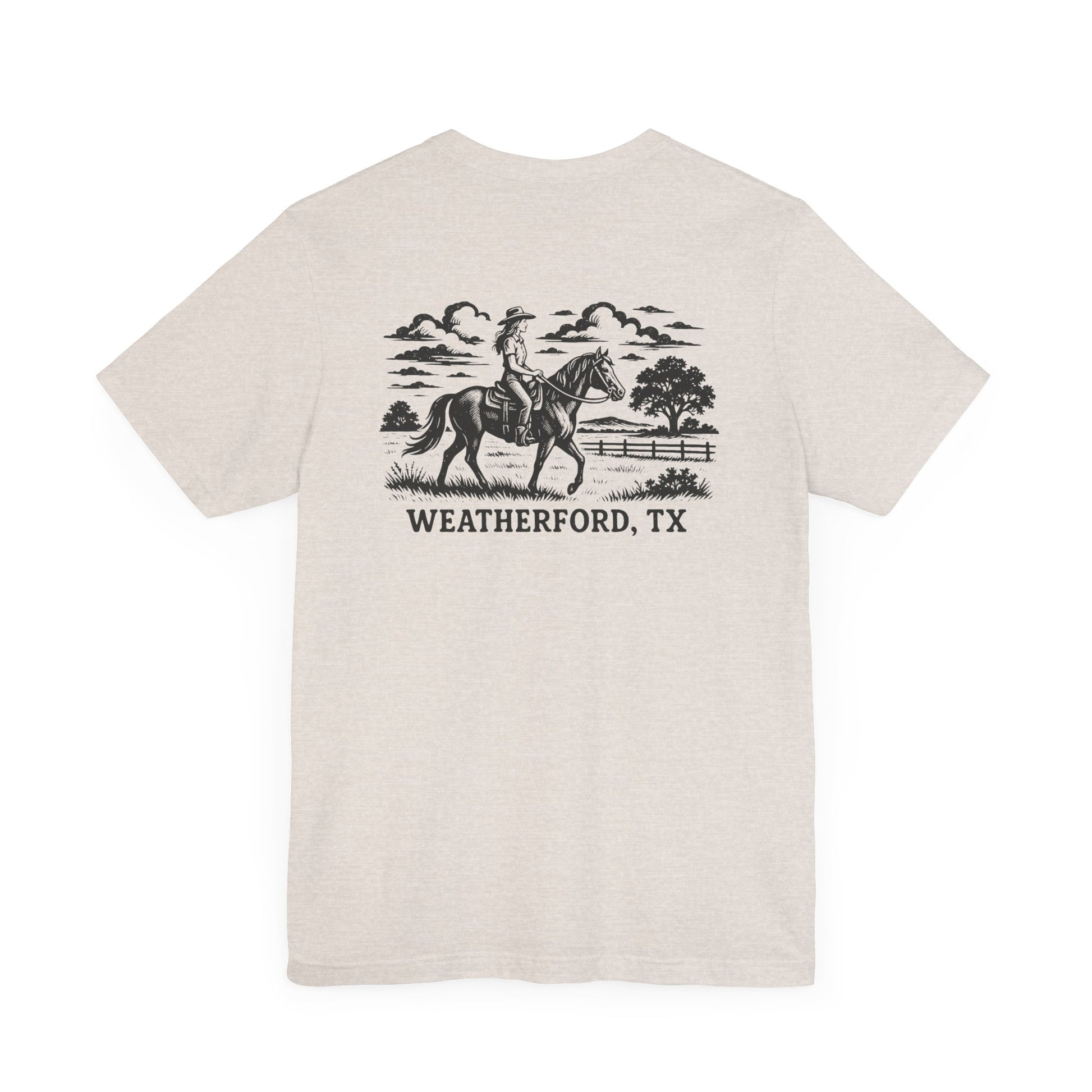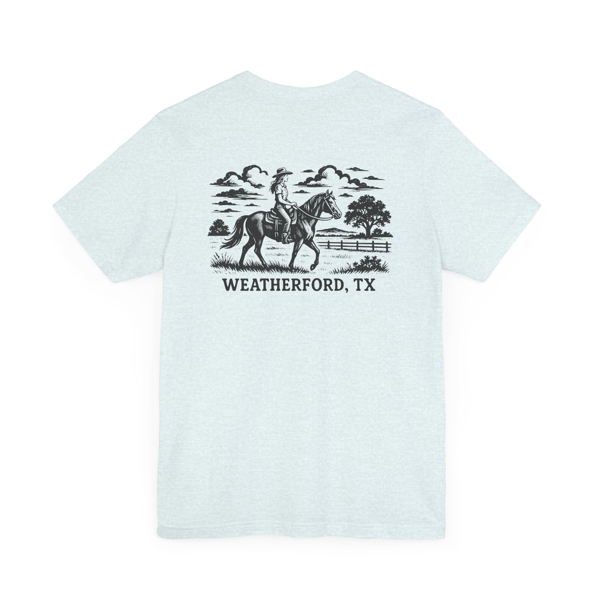 Embrace your love for adventure and comfort with this unisex jersey short sleeve tee. Made from 100% Airlume combed and ring-spun cotton, this lightweight and breathable shirt is perfect for layering or wearing on its own. Its casual yet stylish design makes it ideal for both relaxed weekends and semi-formal gatherings. Perfect for equestrian enthusiasts and anyone who appreciates the charm of Weatherford, TX, this tee is not just about style, but also about comfort and quality. The crew neckline and retail fit ensure it’s suitable for a variety of occasions, from summer outings to holiday celebrations. Whether you're hosting a BBQ, heading out for a picnic, or celebrating local events, this tee adds a touch of flair to your wardrobe.