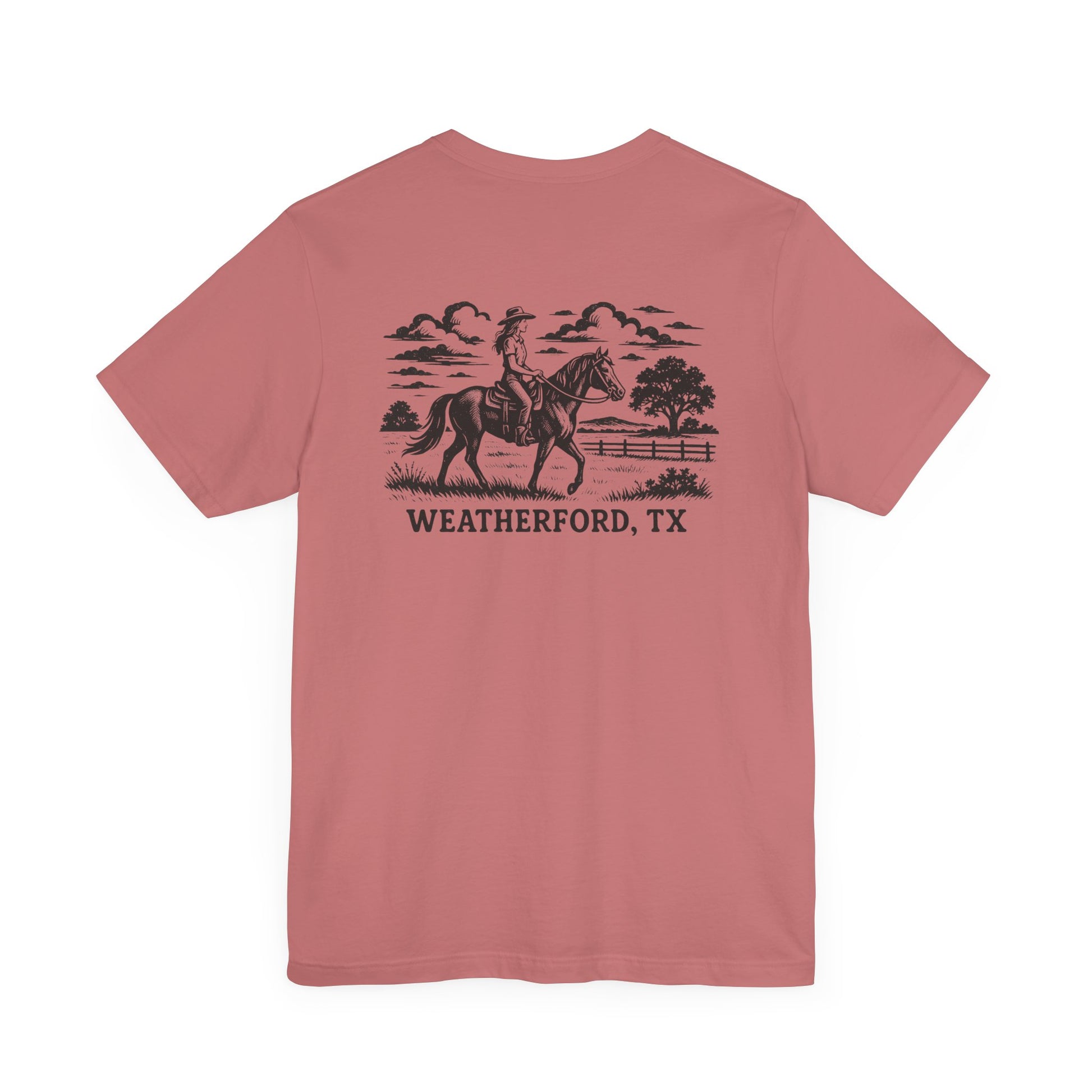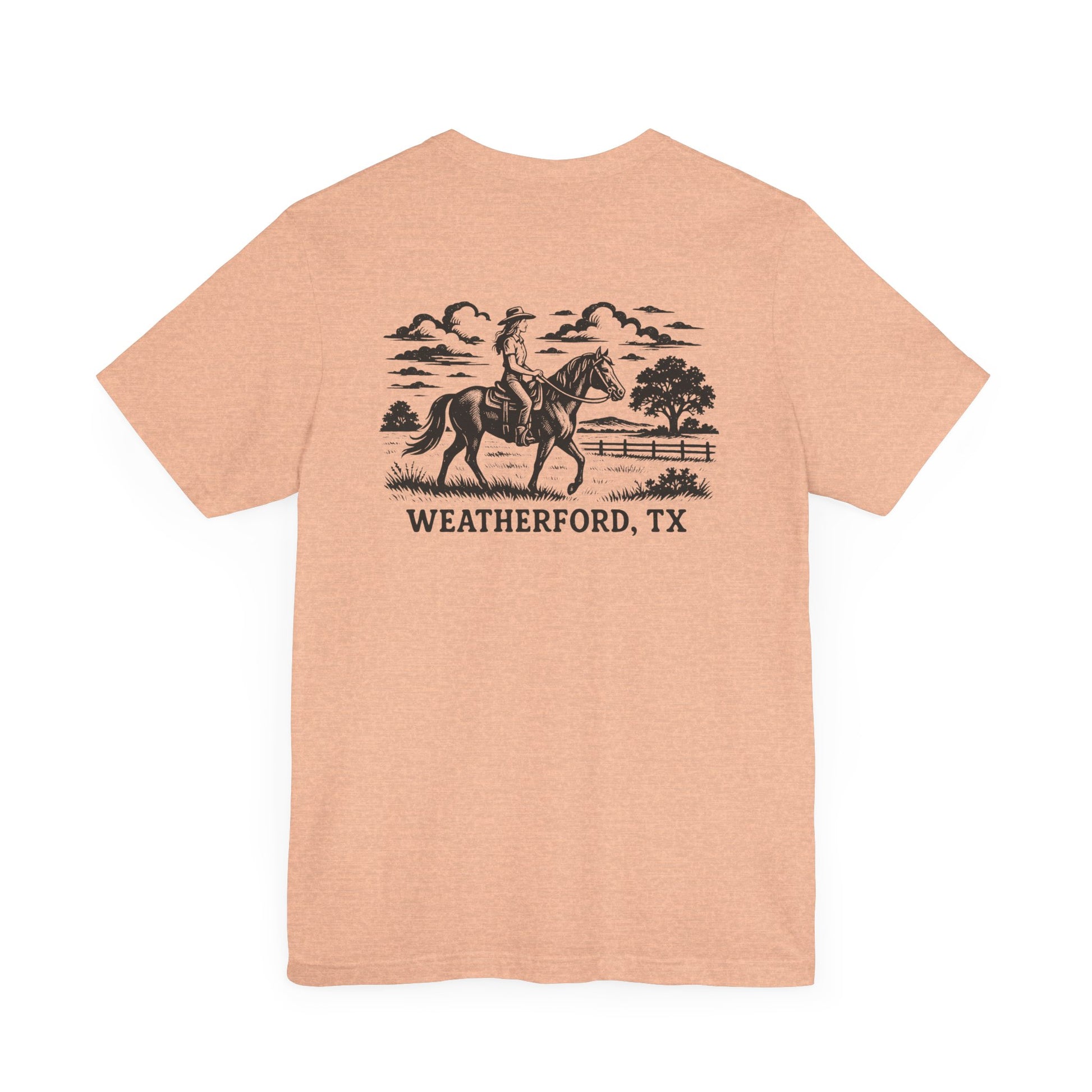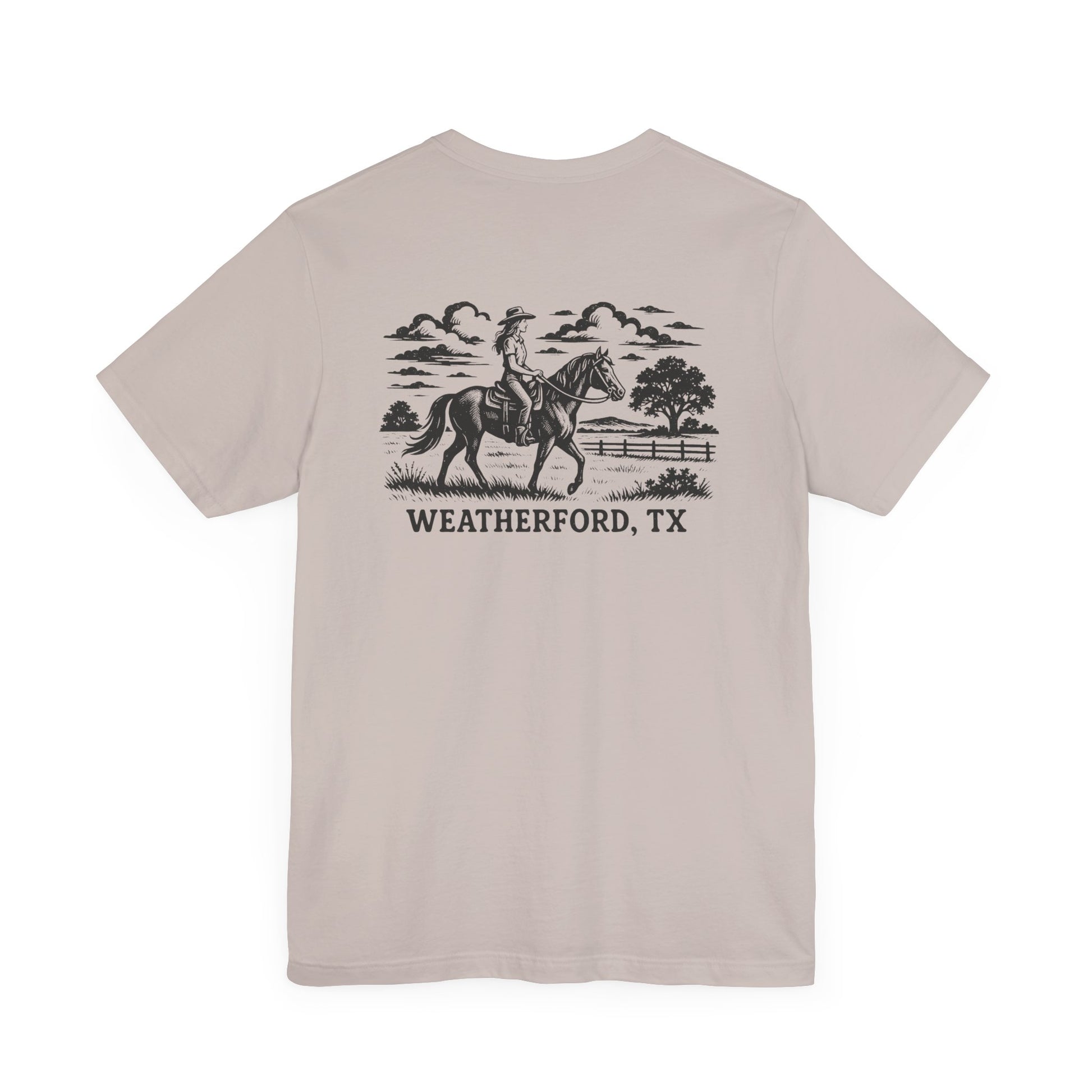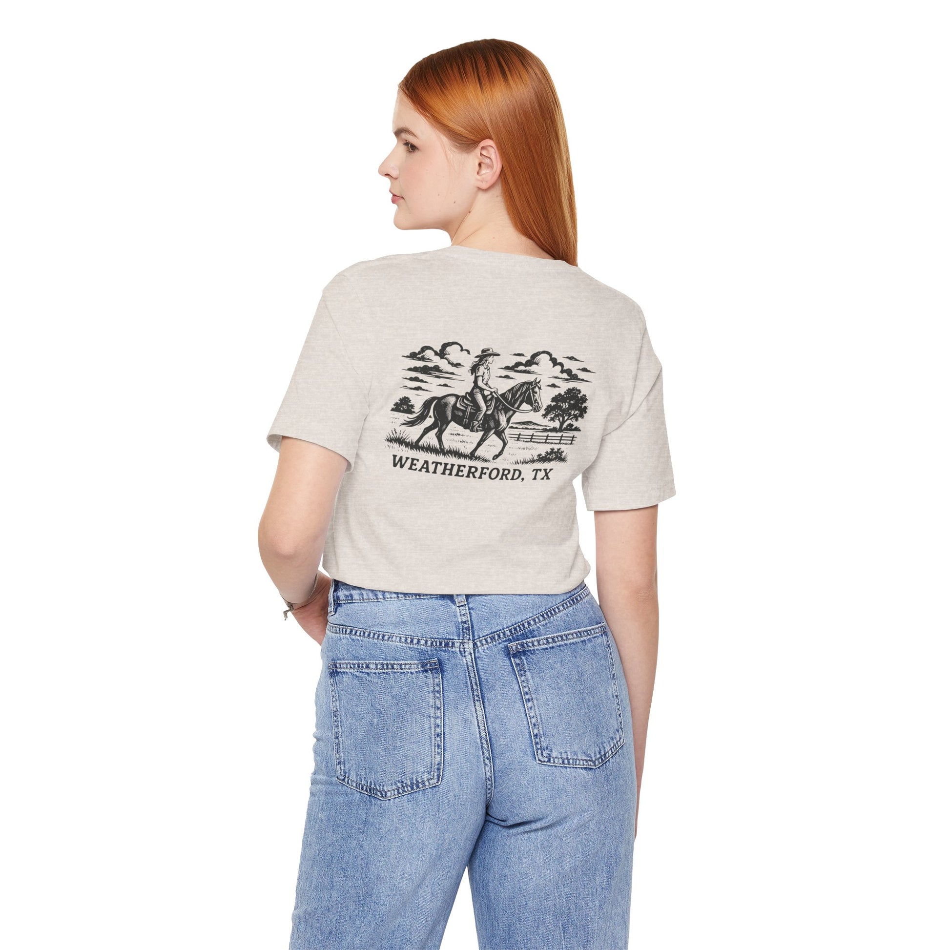 Embrace your love for adventure and comfort with this unisex jersey short sleeve tee. Made from 100% Airlume combed and ring-spun cotton, this lightweight and breathable shirt is perfect for layering or wearing on its own. Its casual yet stylish design makes it ideal for both relaxed weekends and semi-formal gatherings. Perfect for equestrian enthusiasts and anyone who appreciates the charm of Weatherford, TX, this tee is not just about style, but also about comfort and quality. The crew neckline and retail fit ensure it’s suitable for a variety of occasions, from summer outings to holiday celebrations. Whether you're hosting a BBQ, heading out for a picnic, or celebrating local events, this tee adds a touch of flair to your wardrobe.